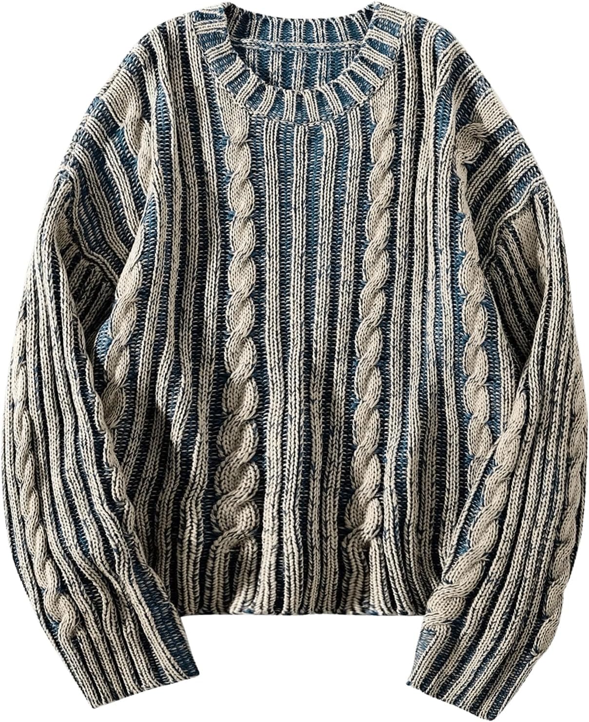 Men Knit Sweater Crewneck Loose Fit Casual Twist Patterned Textured Long Sleeve Cable Knitted Pullover