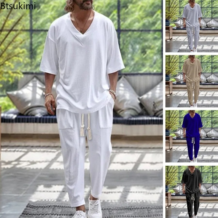 2025 Men Two Piece Sets Fashion Solid Tracksuits Summer Half Sleeve V-neck T-Shirt and Pants Loose Casual Outfit Male Streetwear